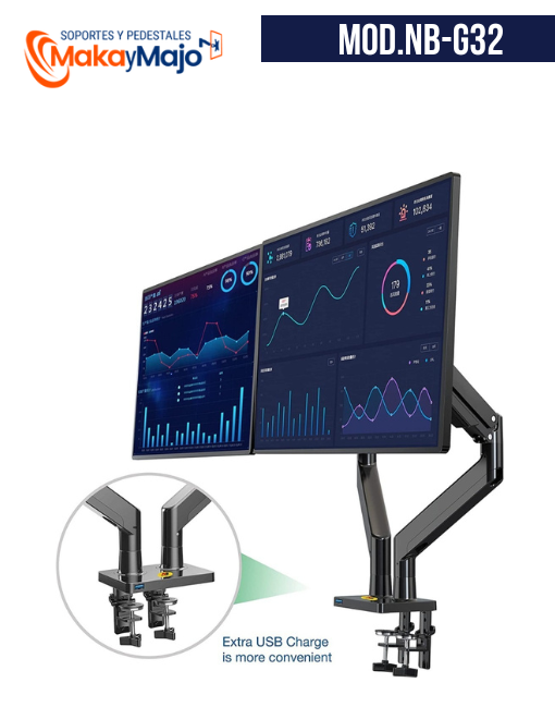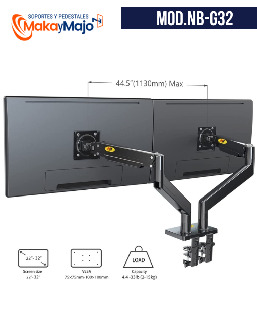 Se adapta a televisores o monitores de pantalla plana LCD, LED de 22″ a 32″ pulgadas de tamaño con una carga de 2 a 15 kilos para cada brazo.